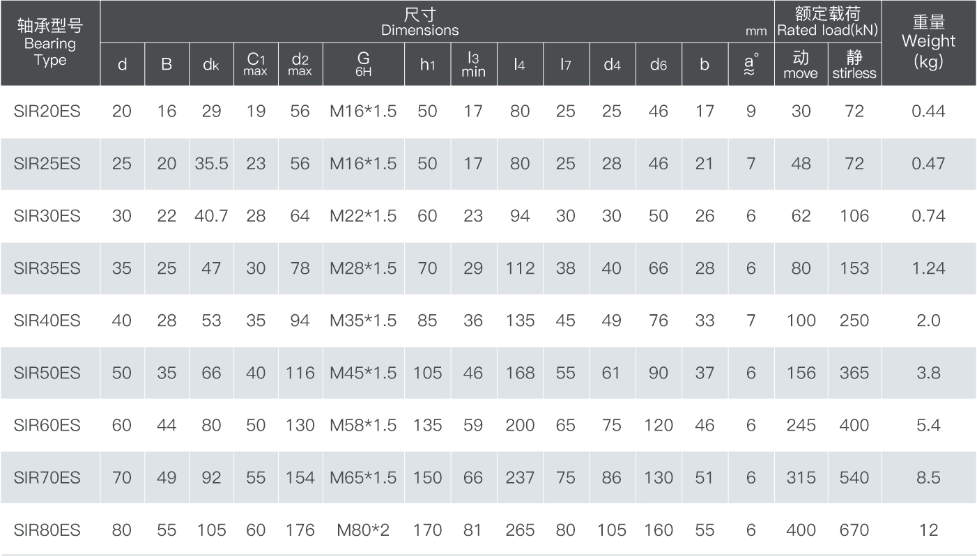 若是左旋螺紋,軸承型號(hào)和螺紋標(biāo)記需加“L”和“左”,例如: SILR30ES M22*1.5左-6H。 d≤40以下型號(hào)螺紋部分沒(méi)有鎖緊螺栓。