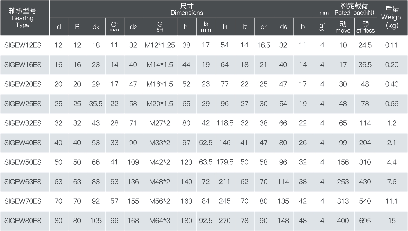 若是左旋螺紋,軸承型號(hào)和螺紋標(biāo)記需加“L”和“左”,例如: SILGEW40ES M33*2左-6H。 d≤40以下型號(hào)螺紋部分沒(méi)有鎖緊螺栓。